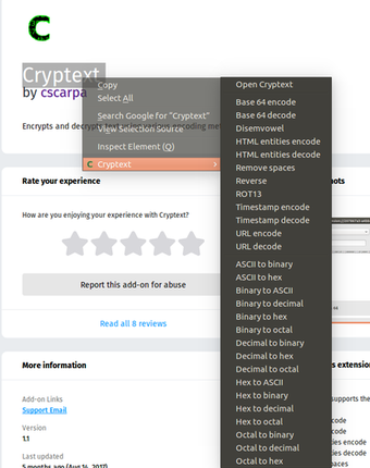 Cryptext는 효율적인 데이터 변환을 위해 설계된 포괄적인 웹 개발 도구입니다. 이 무료 Firefox 확장 프로그램은 ASCII, 이진수, 16진수 및 8진수 형식을 포함한 다양한 변환을 지원합니다. 또한 Base64 인코딩 및 디코딩, 모음 제거 텍스트, HTML 엔티티 인코딩 및 디코딩 기능을 제공합니다. 사용자는 타임스탬프를 조작하고 URL 인코딩 및 디코딩을 쉽게 수행할 수 있습니다.